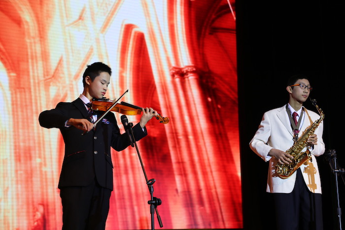 初一初二的老师、同学们冒着霏霏细雨来到了音乐厅,静静地观看精彩的演出。开场的架子鼓狂放不羁,使人禁不住随着鲜明的鼓点拍起手来。歌曲优美,歌声悠扬、舞蹈活泼欢快,舞者们舞姿灵动,更是赢得了现场观众一阵又一阵的掌声。器乐演奏,萨克斯、小提琴的声音带着观众的思绪轻轻飞扬。小品在演员的演绎下幽默生动,引得观众们捧腹大笑……
