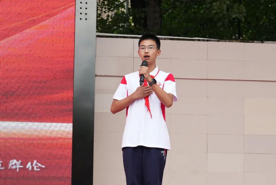 在锦城校区,成都七中初中学校党委委员、副校长吴旭光从中国五千年文明史谈起,回顾了中华文明繁荣昌盛的光辉历程,并谈到近百年的民族屈辱以及新中国成立以来从站起来、富起来到强起来的伟大飞跃。吴校长鼓励七初学子,立凌云之志,修过硬之能,铸自信之魂,扬创新之风,怀天下之情;勉励全校师生作新时代的追梦人,把个人的追求融入党和国家事业之中,铸就精彩人生!
